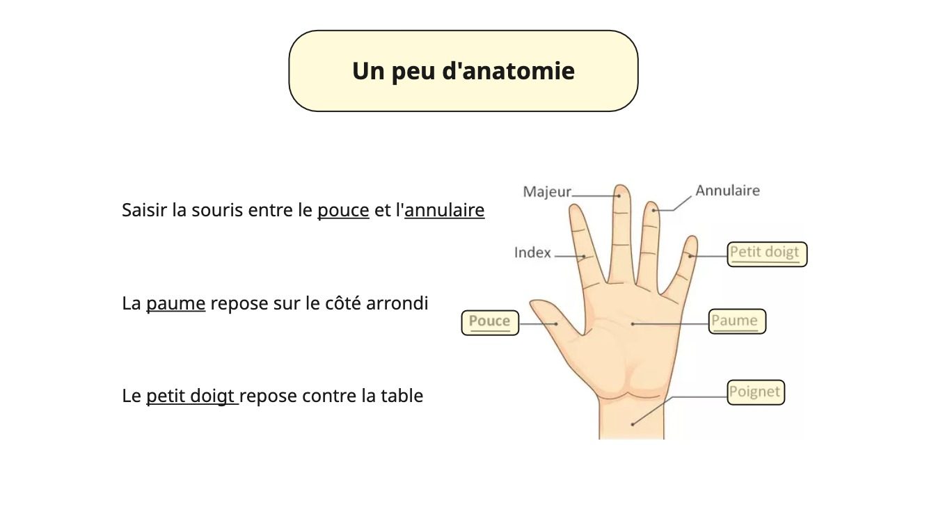 - La souris est tenue entre le pouce et l’annulaire.